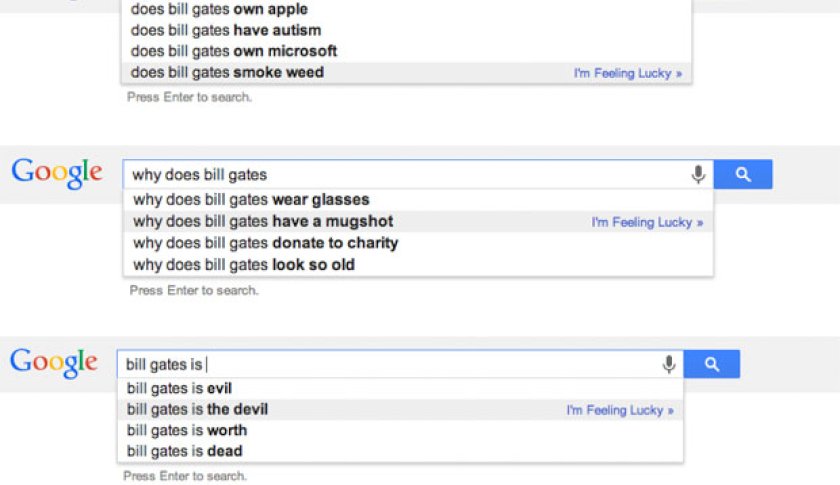 Q: "Does Bill Gates smoke weed?" A: It was once his drug of choice, according to a 1994 biography. Q: "Why does Bill Gates have a mugshot?" A:He was arrested in Albuquerque for driving Microsoft co-founder Paul Allen's car without a license. Q: "Bill Gates is the devil." A:Oh, now, come on.