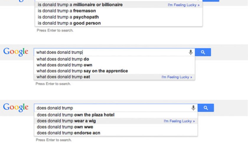 Q: "Is Donald Trump a millionaire or billionaire?" A: Billionaire, with a big ol' "B." Q: "What does Donald Trump eat?" A: Other business executives' lunch, he might say. In all seriousness, though: "All types [of food] -- pastas, steaks," he says. But no alcohol. Q: "Does Donald Trump wear a wig?" A: Negative -- that's his real hair.