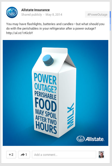 Allstate’s social media approach is to clue its customers in to the inner workings of the company while providing useful life advice at the same time. Its Instagram page is filled with pictures of company events, its Google Plus page shares posts from the company’s blog, its Facebook and Twitter pages are an open dialog with customers, and its YouTube page has a series of informative videos as well as its collection of its iconic “Mayhem” commercials. Is it hard to make insurance feel fun and friendly? Sure. But Allstate is determined to overcome that.