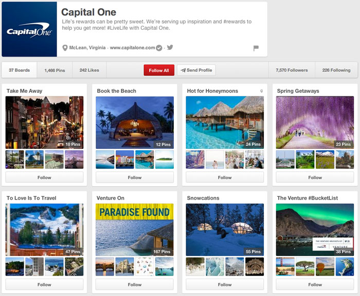 In social media land, Capital One keeps a laser focus on customer service and community building. On its Facebook and Twitter pages, the bank responds to almost every customer comment, regardless of whether the comment is positive or negative. On Instagram, it posts images of places to visit, action shots from concerts and events, and commonplace pictures of food and coffee. On Pinterest, Capital One has a few dozen boards dedicated to holiday campaigns and DIY crafts, and the company has also taken advantage of the “place pins” feature by mapping out dream honeymoon spots.