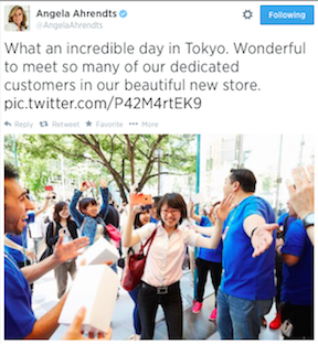 On Thursday, it posted a pre-opening video of the big glass box on YouTube — the first time it’s ever done that, according to ifoapplestore‘s Gary Allen. And it flew Angela Ahrendts out to oversee the festivities. It was a coming out party of sorts for Burberry’s former CEO, who was hired by Apple in October but didn’t officially join the company until last month. She sent her first memo to Apple’s retail staff Thursday, and her first tweet from Omotesando.