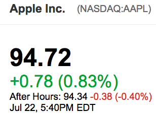Apple’s shares, which closed at $94.72, up $0.78 (0.83%) for the day, were basically flat in after-market trading.