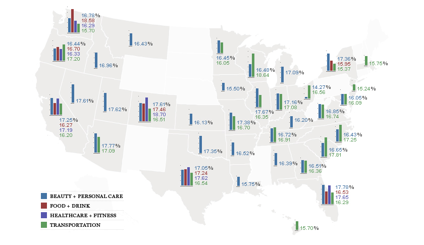 Interestingly, some tipping trends are fairly uniform across the country. Beauty and personal care professionals tend to receive the biggest tips — on average closer to 20% than to 15%. Taxis and limousines skew lower, with average tips below 16% in many states. Tips at restaurant bars show the most variability, with New York fast-food joints receiving an average of 14.77% and bars and lounges in Texas getting 19.66%.