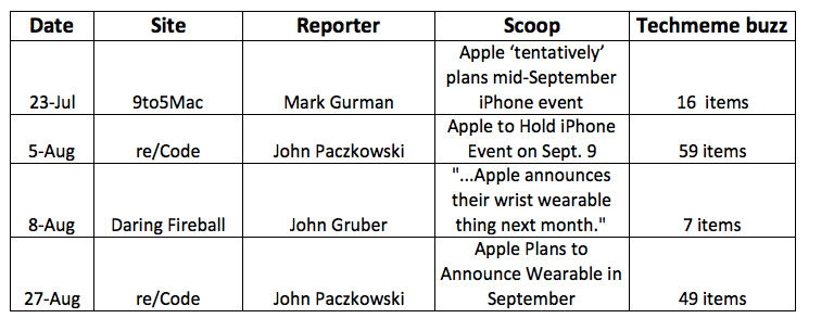 Judging from the buzz on Techmeme, it seems to matter less what Gruber or 9to5Mac‘s Mark Gurman say. When re/Code’s John Paczkowski reports that Apple is going to reveal something on such and such a date, the rest of the press climbs on board.