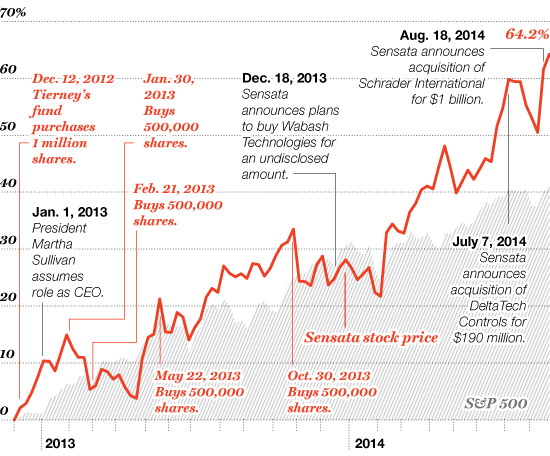 Tierney admires the clear vision of Sensata CEO Martha Sullivan. She has vowed to double revenues between 2012 and 2017, he says, through organic growth and takeovers. (Revenues increased 13%, to $2.1 billion, in the fiscal year ended June 30.) Recently the company announced the acquisition of tire-sensor maker Schrader International, which is benefiting from its own tailwinds: Tire-pressure sensors are now required in North America and South Korea, and will be mandated for new cars in Europe after November 2014. Tierney says Schrader was a “quality” acquisition.
