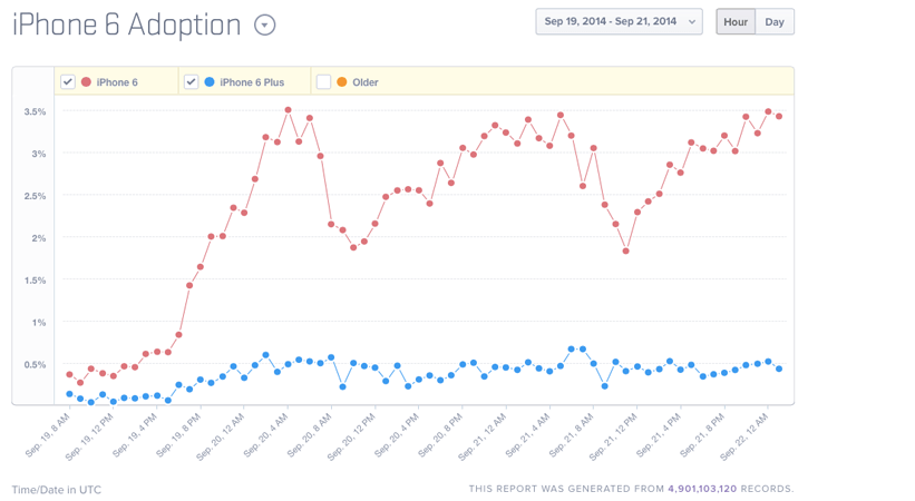 The chart above happens be from the mobile analytics firm Mixpanel, but the ones put out by its competitors, Chitika and Fiksu, are not much different. They all show iPhone 6 activity (in-app purchases, etc.) Over the first three days outpacing the iPhone 6 Plus by more than seven to one.