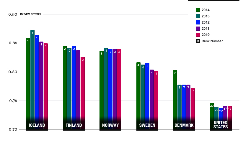 Iceland, which has had a female head of state in 20 of the past 50 years, ranked No. 1 on WEF’s index with a score of.859. The country was closely followed by its Nordic neighbors: Finland, Norway, Sweden and Denmark. The U.S. Finished with a score of.746, putting it behind countries like Canada, South Africa and France, but ahead of other developed countries like the United Kingdom and Australia.