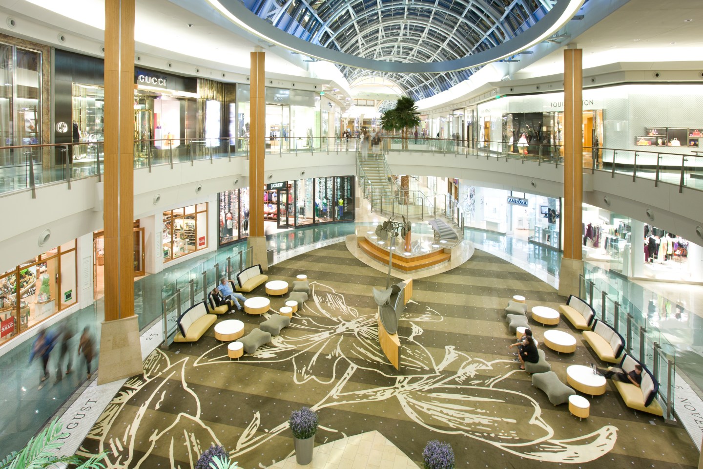 This 1.2 million square foot luxury mall, opened in 2002, has emphasized dramatic architecture to distinguish itself, including a palm tree promenade at the valet entrance and vaulted end-to-end skylights eight stories high. It boasts twelve 10-foot tall LED screens atop 35-foot masts circling the terrazzo-tiled grand court that present the latest in fashion.