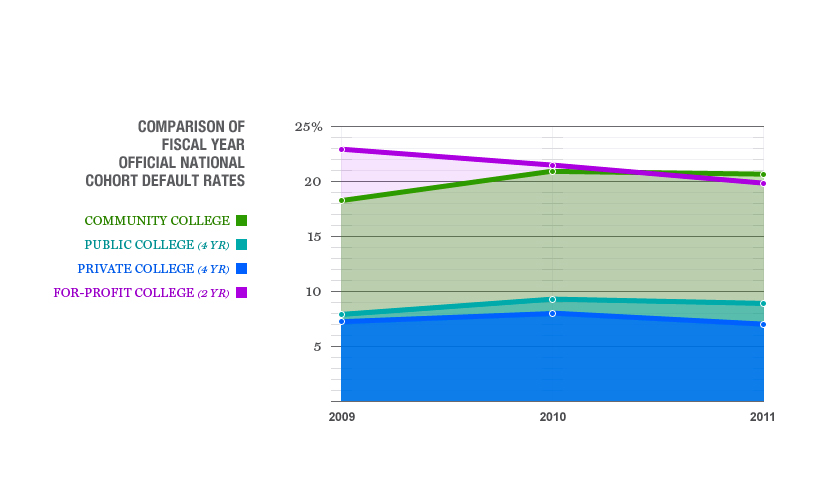 But here comes the bad news: community college students are defaulting on their loans at more than twice the rate of their counterparts at four-year non-profit schools, according to analysis by the Georgetown Center. In fiscal year 2011—the most recent year for which data is available—student borrowers at community colleges defaulted at a rate of 20.6%, compared to 8.9% for students at four-year public colleges and 7% for private university students. Community college students even defaulted on their loans at a higher rate than students who took on debt to attend two-year for-profit schools (19.8%).