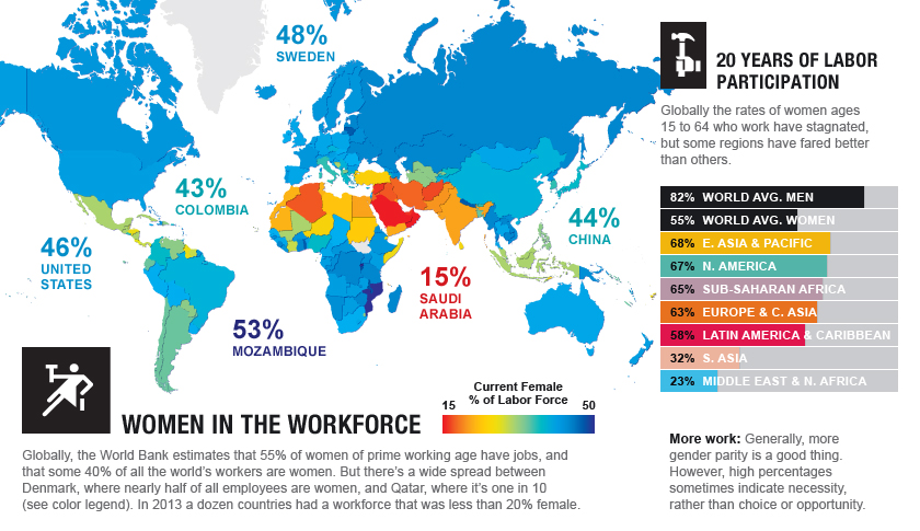 Interestingly, those same 2013 World Bank figures show the highest numbers of working women in African countries like Benin, Burkina Faso, Ethiopia, and Kenya. The lowest numbers in the world are in conservative Islamic strongholds like Iran, Iraq, Jordan, and Saudi Arabia (though Saudi women’s number are growing).