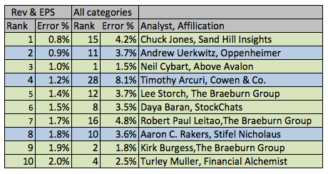 - Kudos to Chuck Jones of Sand Hill Insights for best estimates of Apple’s top and bottom lines and to Above Avalon’s Neil Cybart for taking the top spot in “all categories.”