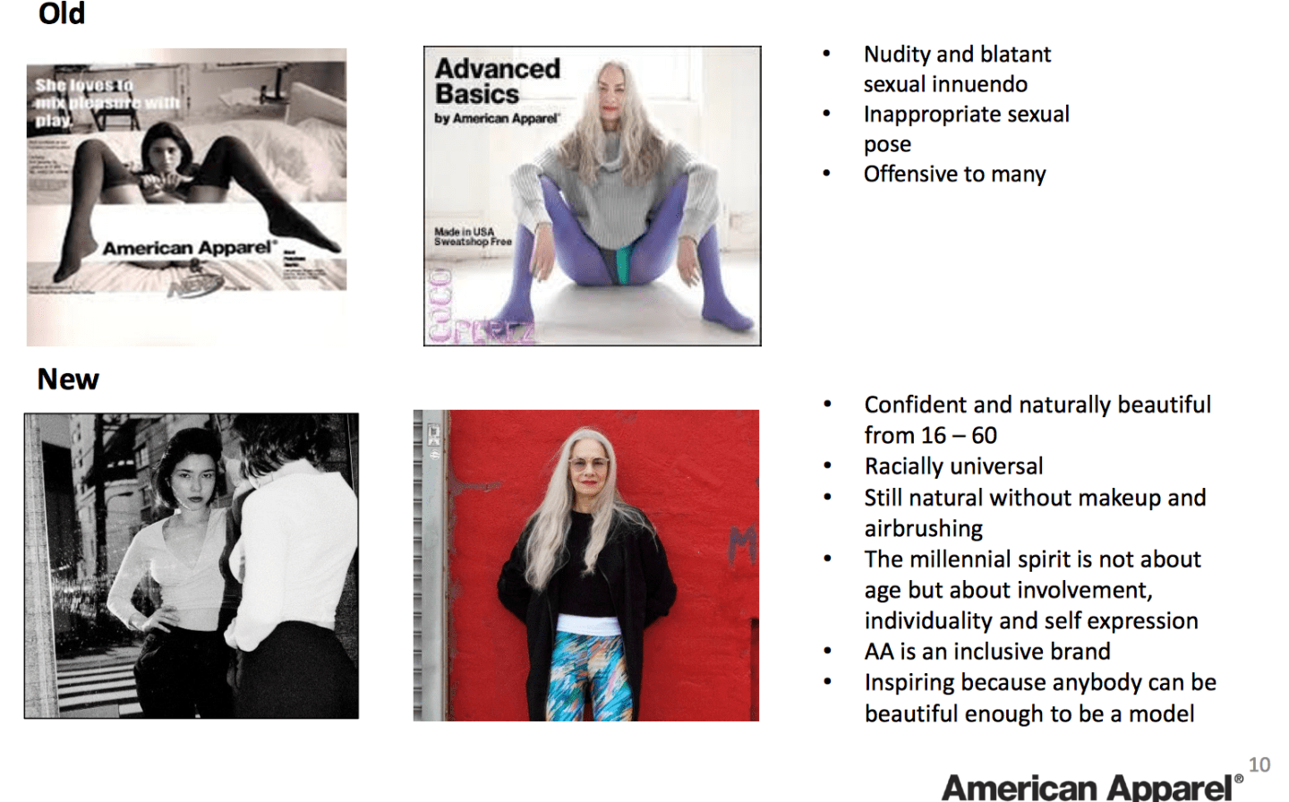 In its filing, American Apparel said it plans to “recast the brand in a positive, inclusive, socially conscious light.” That means ditching the “nudity and blatant sexual innuendo” that was its hallmark for years but that was “offensive to many.” The new incarnation of the brand is targeted at the “confident and naturally beautiful from 16 — 60,” and aims to be “racially universal.”
