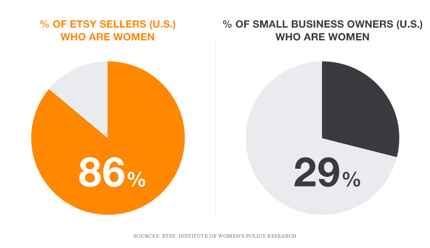 At Etsy, women rule. According to the company’s second annual seller report, 86% of Etsy sellers are female. That’s a dramatic departure from overall trend: Only about a third of U.S. Small businesses are women-owned, according a report from the Institute of Women’s Policy Research.