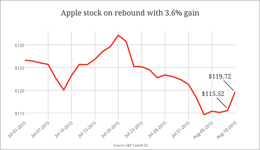 “Apple’s shares may have found a bottom,” wrote Sand Hill Insights’ Chuck Jones over the weekend. On Monday the stock complied. It closed at $119.72, up $4.20 (3.64%) for the day.