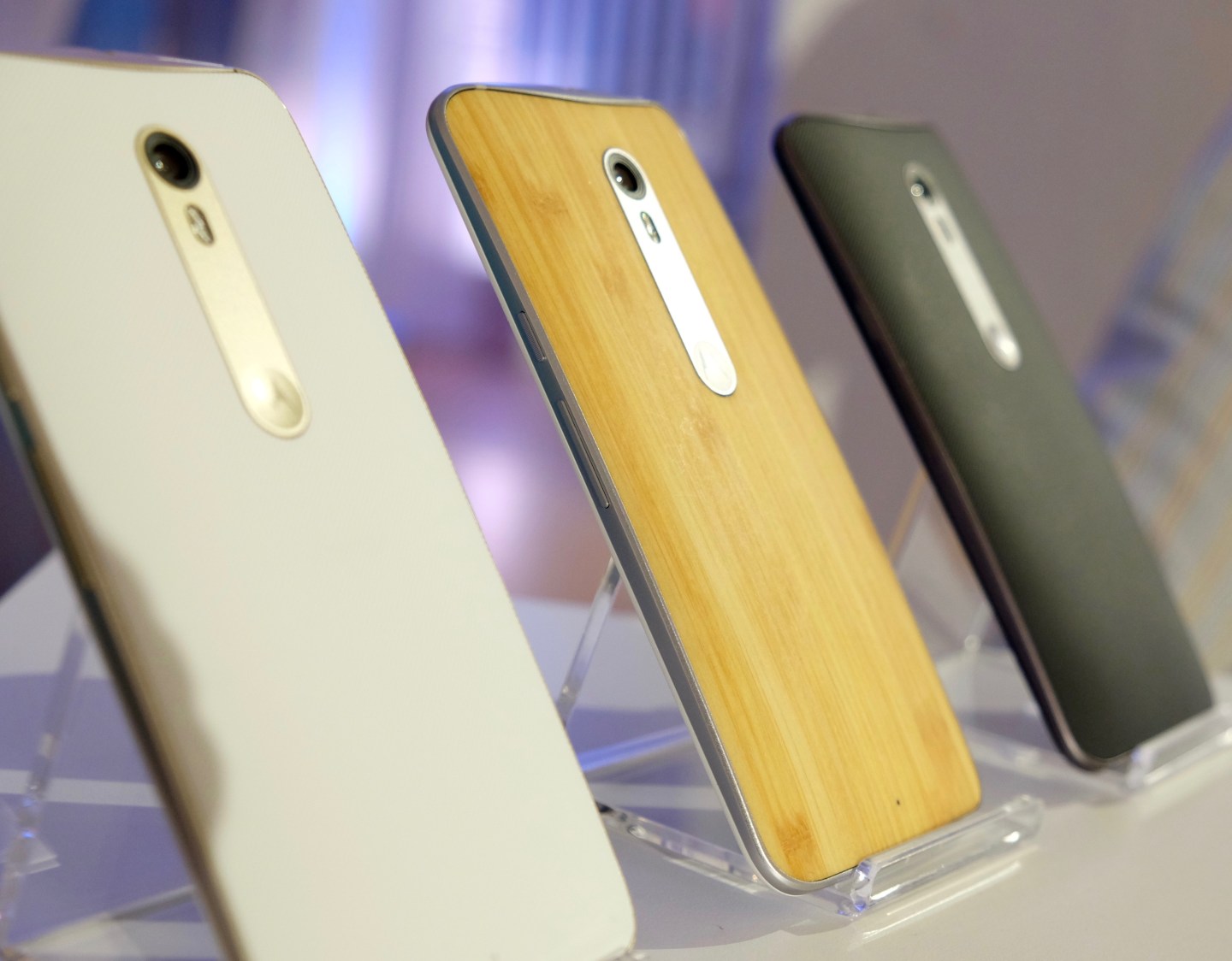 Alongside Motorola’s site, Amazon and Best Buy will also field orders, but most will likely want to order the device directly from Motorola, since it’s the only way to take advantage of the company’s Moto Maker customization. On the site, consumers will be able to customize the look and feel of the device’s housing with wood, leather, or coated silicone rubber (CSR) in various colors and textures, along with accent colors (including either a black or white front).