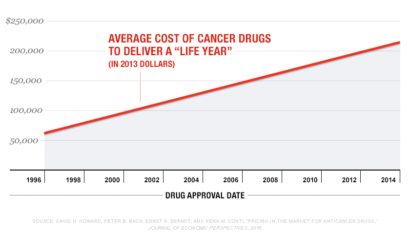 Across the universe of these drugs, prices are rising faster than benefits. In 1995 the average cost of using a cancer drug to deliver a “life year” of benefit to a patient was around $50,000 in current dollars; today that precious year costs about $225,000.