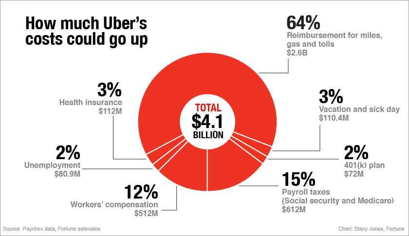 Add all of those costs up and you get to just over $4.1 billion. Sound too high? I thought so, too. So I had StaffOne’s Donna Meek, a payroll and HR expert, run her own independent calculation. Meek estimated the costs from the bottom up, looking at what it would cost Uber per worker, rather getting the total figures for each cost as I did. Meek’s conclusion: nearly $1.5 billion before the cost of reimbursing drivers for their miles. So pretty close to what I got.