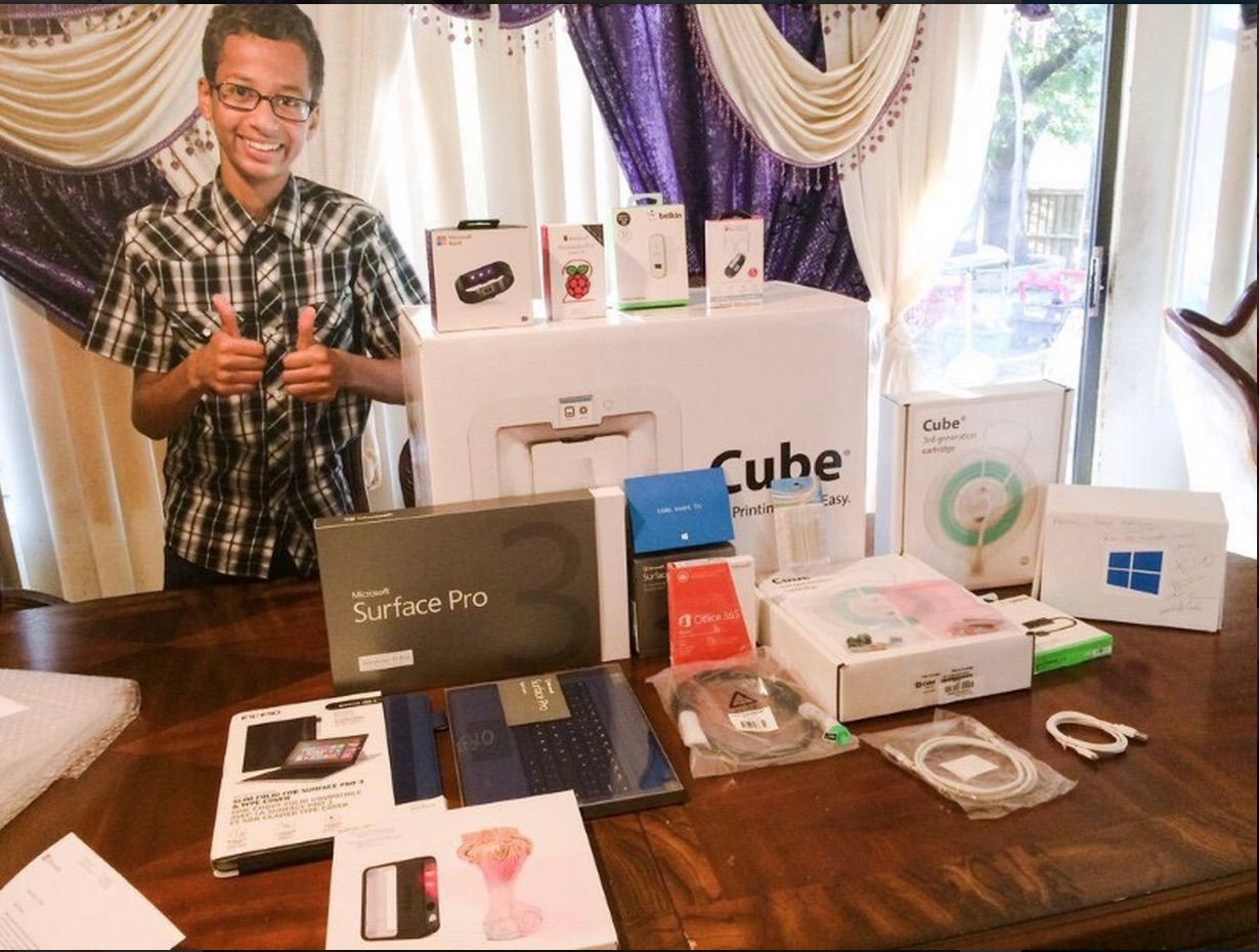 The Irving, Texas high school student who freaked out his teachers and was arrested by local police for bringing a home-made clock to school, now has a bunch of new tech swag, including a Surface Pro 3 from his new best friends at Microsoft (MSFT).