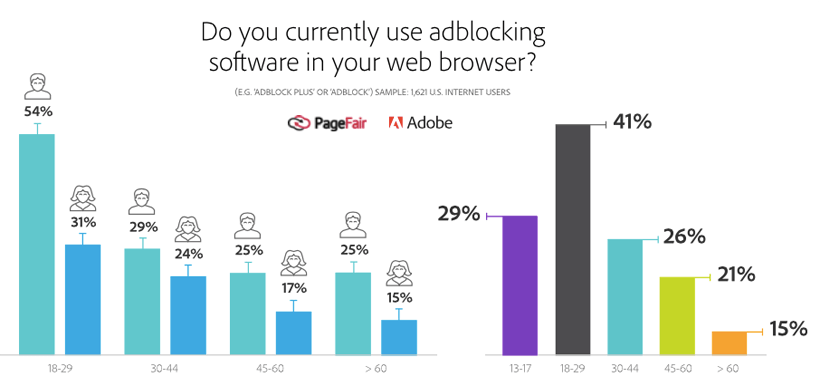 - They are largely millennials. Peak usage is with 18-29 year olds, 41% of whom claim to use adblock software.