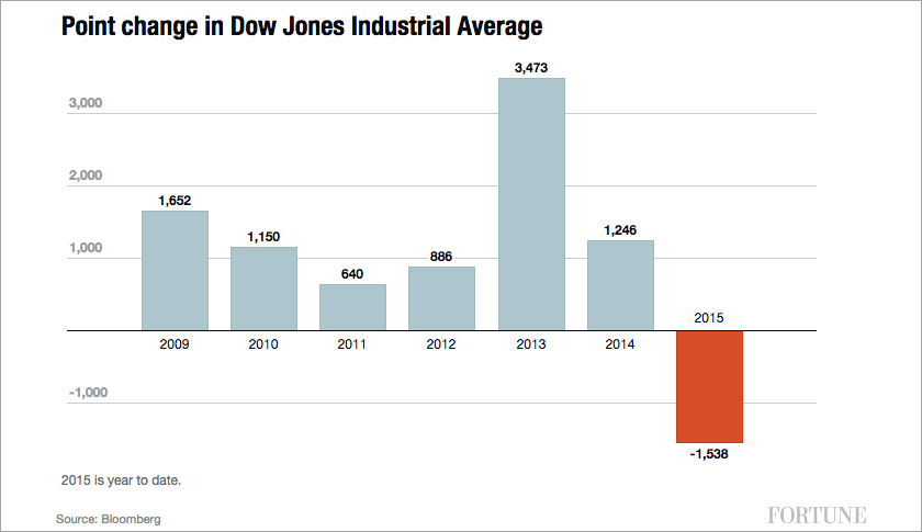 So I did some simple math and figured out what it would take for 2015 to avoid being the worst year for the market since the financial crisis. My basic conclusion: Don’t hold your breath. The Dow is currently at 16,284. It would have to get to 18,803 to avoid being the worst year since 2008. That’s 2,519 points, or 15%, higher than where it is now.