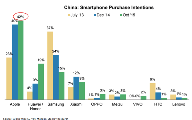Consider, specifically, the chart above, posted over the weekend by Morgan Stanley analyst Katy Huberty. It shows, based on Internet searches and social media data, which phones the Chinese seem to want to buy.