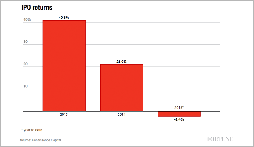 IPOs have always been a hit and miss business. But investors have often been willing to take that risk because returns from investing in IPOs that do well typically far outperform the flops. That hasn’t been the case this year. On average, shares of companies that have gone public this year have fallen 2.4%. That compares to a gain of 21% last year, and 42% in 2013.