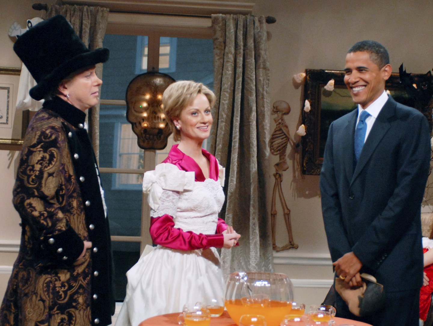 Our current President showed up for a surprise appearance in a cold open sketch as a guest at a Halloween party hosted by Hillary Clinton (as portrayed by Amy Poehler). Obama, who was then vying against Clinton for the Democratic nomination, pulled off a mask with his own likeness to reveal it was actually him underneath. When asked why he dressed as himself for the party, Obama said in the sketch: "I'm not going to change who I am just because it's Halloween."