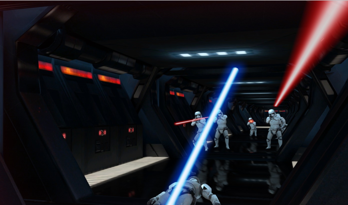 The game itself is pretty basic – an “on-rails” action title (one that moves you along a fixed path, giving you no control on where you go) where you attempt to deflect the incoming laser blasts of storm troopers as you attempt to escape an Empire Star Destroyer. Take out one wave of troops, then move on to another. Rinse. Wash. Repeat.