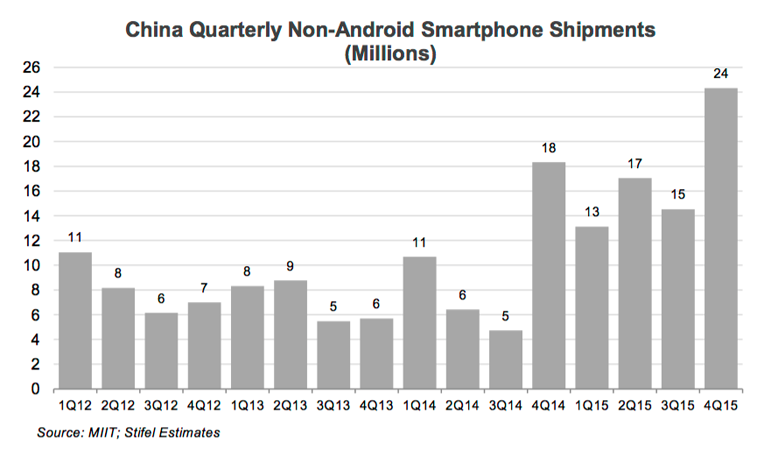 “Android smartphones are estimated to have accounted for approximately 81% of total C4Q15 China domestic smartphone shipments, down from 88% in C3Q15 and 82.5% in C4Q14. This leaves total non-Android (Apple iPhone = majority?) Shipments at a record ~24.3 million in C4Q15, an increase from 18. 3 million in C4Q14 and up from 14.5 in the prior quarter—implied non-Android smartphone phone shipments up 33% y/y and 67% sequentially in C4Q15.”