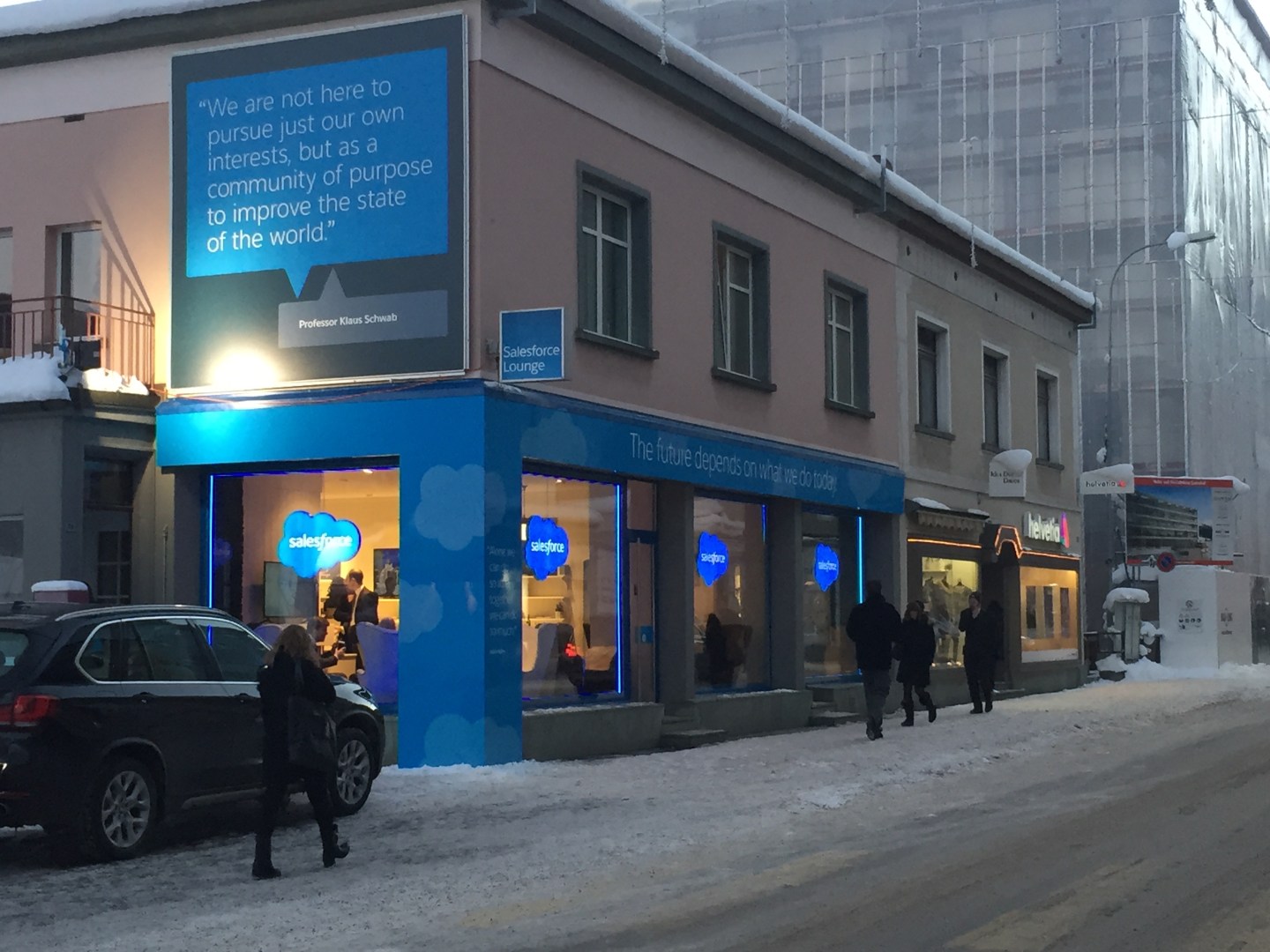 Salesforce is not the only company with a Davos pop-up. Up and down the main commercial street in Davos, the Swiss Alp town that hosts the annual confab for CEOs, politicians, and top policy makers, companies have rented out retail space, replacing the local shops and turning the typically quiet ski village into a marketing destination for some of the world’s largest companies. Gone are the usual cuckoo clock stores.