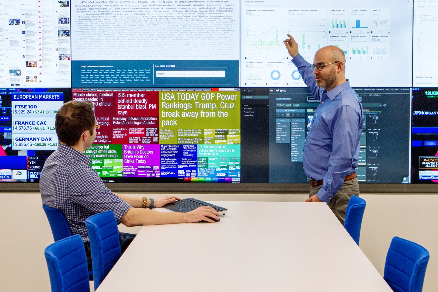 Not literally, of course. At the company’s Purchase, N.Y., headquarters, product managers gaze at a 40-foot display that broadcasts feeds, visualizations, and performance metrics for more than 60 markets. When they want to dive deeper into the data, they retreat to Insights Alley, a clutch of casual lounges with 55-inch touch screens. And when they want to watch narratives unfold, they visit the Real-Time Marketing Lab, where eight more displays—nearly an entire wall’s worth—highlight trending stories from services like NewsWhip’s Spike and analysis from sources such as Prime Research.