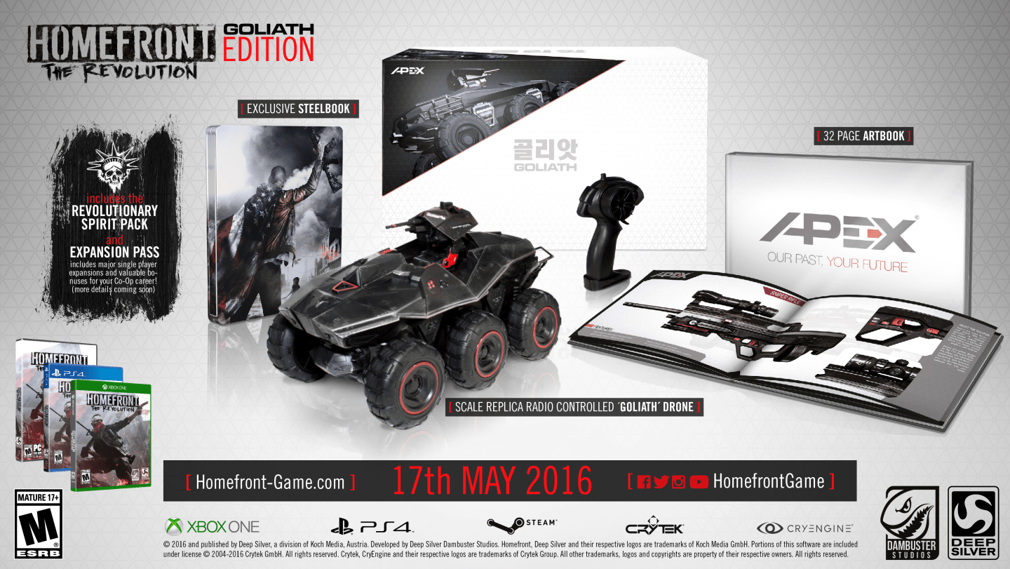 Publisher Deep Silver, a subsidiary of Koch Media, will offer gamers the Homefront: The Revolution Goliath Edition game for $160 on May 17. That’s in addition to the traditional $60 versions for PlayStation 4, Xbox One, and Windows PC.