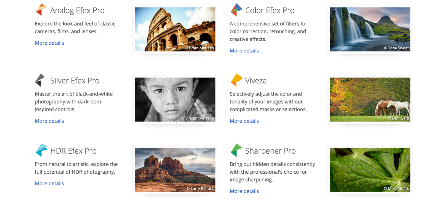 The seven plug-in tools in the Nik suite can be integrated with software from other providers, including Adobe Photoshop and Lightroom as well as Apple Aperture. Those plug-ins cover retouching, color correction, photo filters, and image sharpening, among other facets.