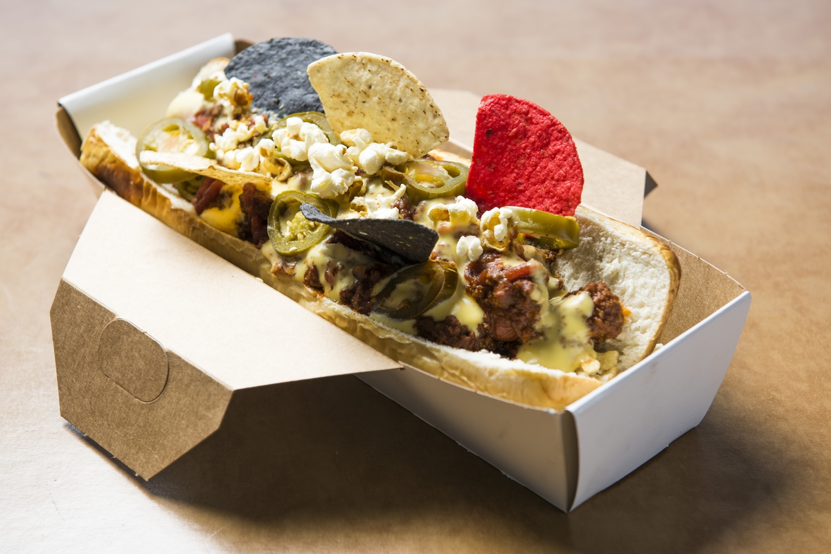 The $15 Everything Dog is a footlong hot dog on a pretzel bun replete with fries, chili, nacho chips, beer cheese, and jalapenos, with popcorn on top and squiggled over with Coca-Cola-infused barbecue sauce.