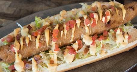 No need to mince words: the Cheeseburger Dog ($10) is a giant hot dog made from cheeseburger. Need more description? Char-grilled hamburgers are ground up, mixed with chopped bacon, pickles, green onion, and cheddar cheese, formed into a foot-long tube and then frozen. They’re then breaded, seasoned and dunked in the deep fryer, and topped with more bacon, lettuce, tomato, and secret sauce.