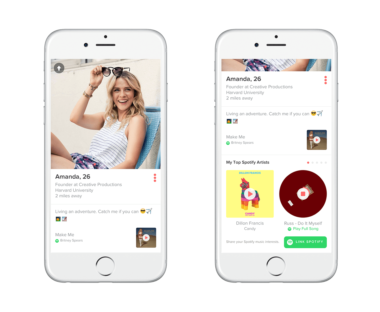 When checking out another user’s profile, Tinder singles can also tap to listen to short clips of their favorite songs.