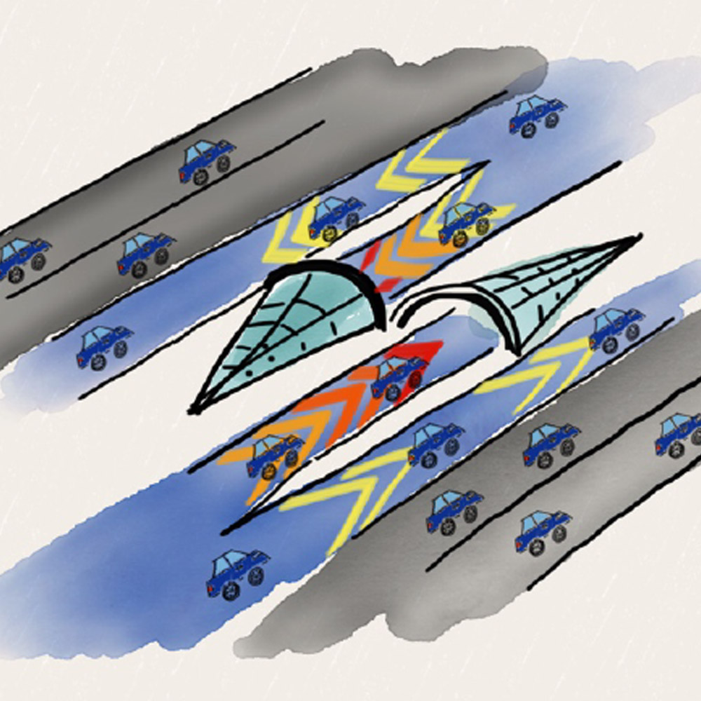 That notion was expressed in the pair’s final product. Not only do automobiles on the Hyperlane move quickly, but also the plan calls for various tolled stations where self-driving cars, courier trucks, and buses can get on or get off like a highway exit. While a recent poll found that the majority of Americans still fear riding in self-driving cars, Hyperlane safety is monitored with embedded sensor technology that regulates the flow of traffic along with the autonomous vehicles’ built-in computers.
