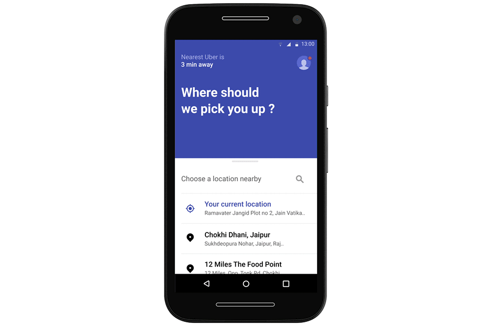 To save on data and storage, Uber Lite immediately suggests nearby businesses or landmarks based on the user’s location rather than a map or a text entry box. The app also tries to guess the user’s destination based on popular spots in the city.
