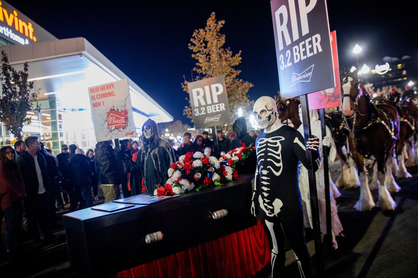 The makers of national beers like Budweiser are marking the occasion with new marketing efforts in the state. The iconic Budweiser Clydesdale were in Salt Lake City this week to mark the occasion with a mock funeral, compete with life-sized coffin and costumed grim-reaper pallbearers walking the streets to cheers.