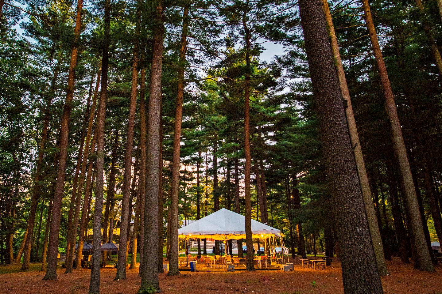 While everyone on campus takes COVID-19 tests twice a week, masks are not required out in the woods, where furniture is spaced well apart and a safe distance can be maintained. The firm’s team quickly assembled open-sided tents as shelter from the elements, upgraded the Wi-Fi, and procured additional kayaks for socially-distanced recreation. Bridgewater’s famous three-hour Monday morning “What’s Going On In the World” meeting now includes 25 people congregated under the main meeting tent, plus more than 100 others Zooming in on the large screen mounted to its side. In the background is a thicket of tall pines, their needles forming a reddish carpet beneath.