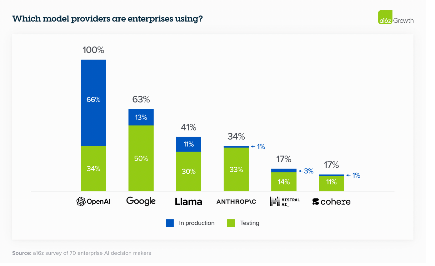 Sarah Wang, an a16z general partner who coauthored the survey, said OpenAI’s biggest advantage up until now has been that of first mover. In addition, it has been tough to push off its top perch, she explained, because for most of the past year, GPT-4 has also been considered the best model available, as well as easy to access directly through an API or via Microsoft Azure.