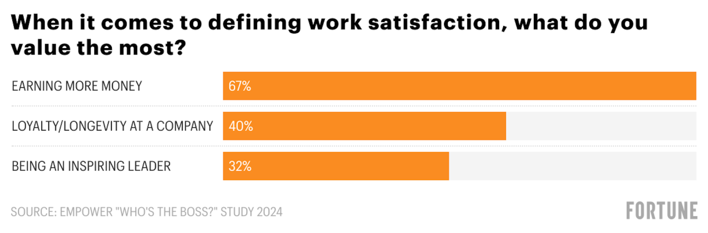 However, money is the number one driver of job satisfaction (67%) over being a boss. Respondents also say work satisfaction comes from being rewarded for loyalty and longevity at a company (40%), and under a third (32%) say it comes from being an inspiring leader the most. The survey also finds that 38% (and 55% of Gen Z) believe they don’t get paid enough to go above and beyond their current job description.