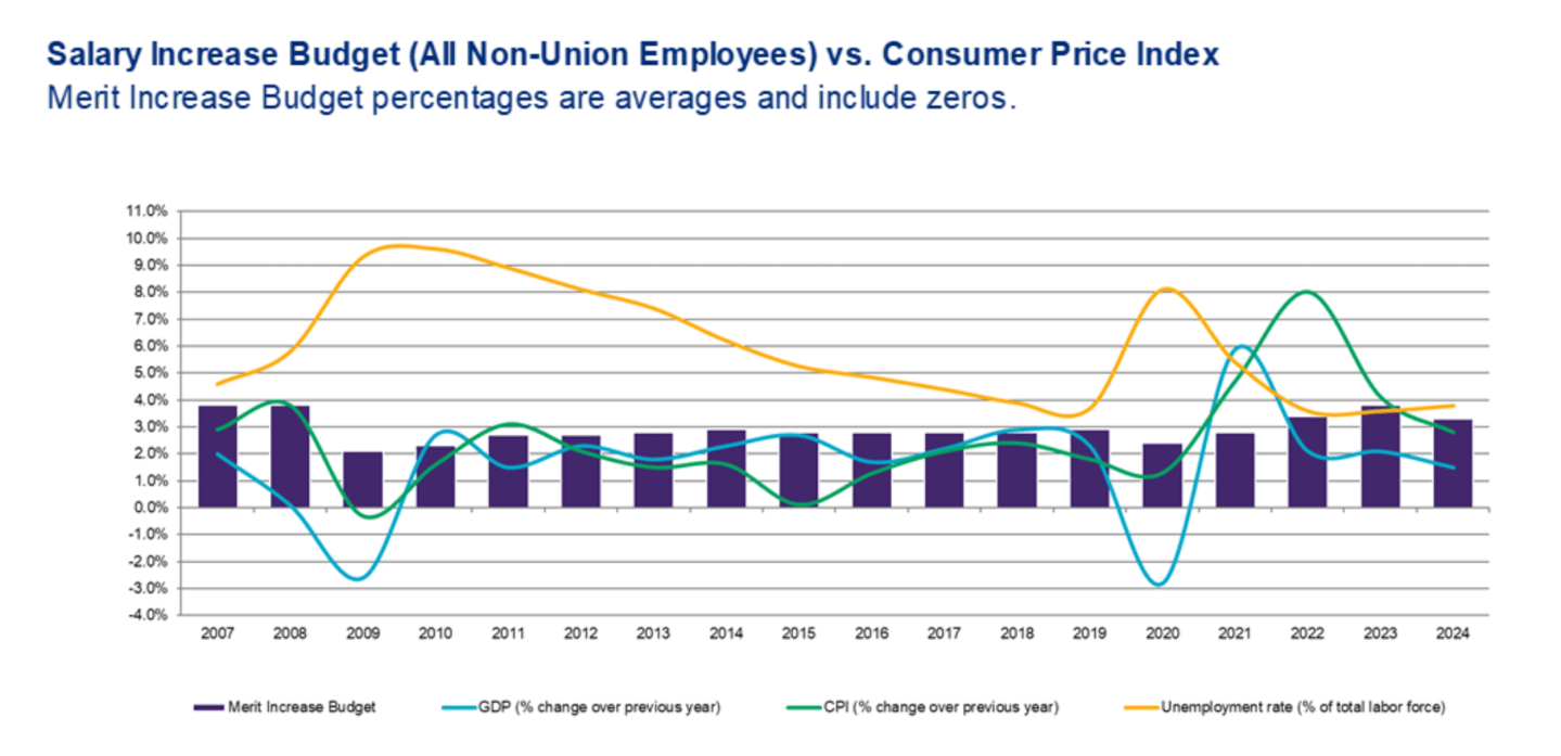 According to Mercer’s March 2024 U.S. Compensation Planning survey, on average, employers raised compensation budgets by 3.3% for merit increases and 3.6% for total salary increases for non-unionized employees—both figures coming in lower than November projections of 3.5% and 3.8%, respectively.