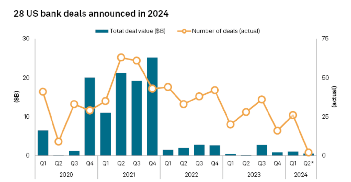 A total of 28 U.S. Bank deals worth a combined $1.59 billion were announced in 2024 through April 15, according to an S&P Global Market Intelligence analysis.