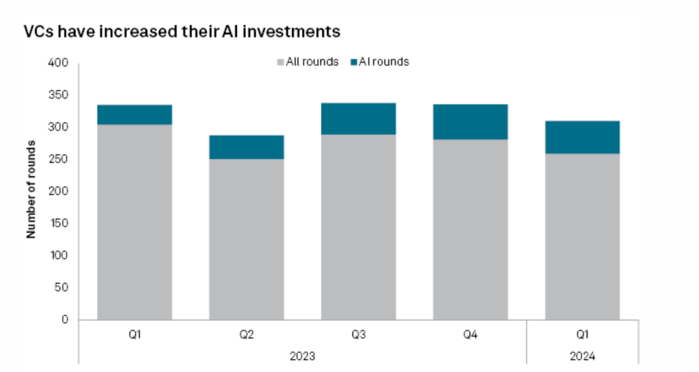 A new S&P Global Market Intelligence report finds that in Q1, the top 35 venture capital firms announced 51 artificial intelligence funding rounds, up from 31 at the same time last year. AI represented a larger share of firms' total investments, increasing to one out of every five in early 2024 compared to one out of every 10 in early 2023, according to the report.