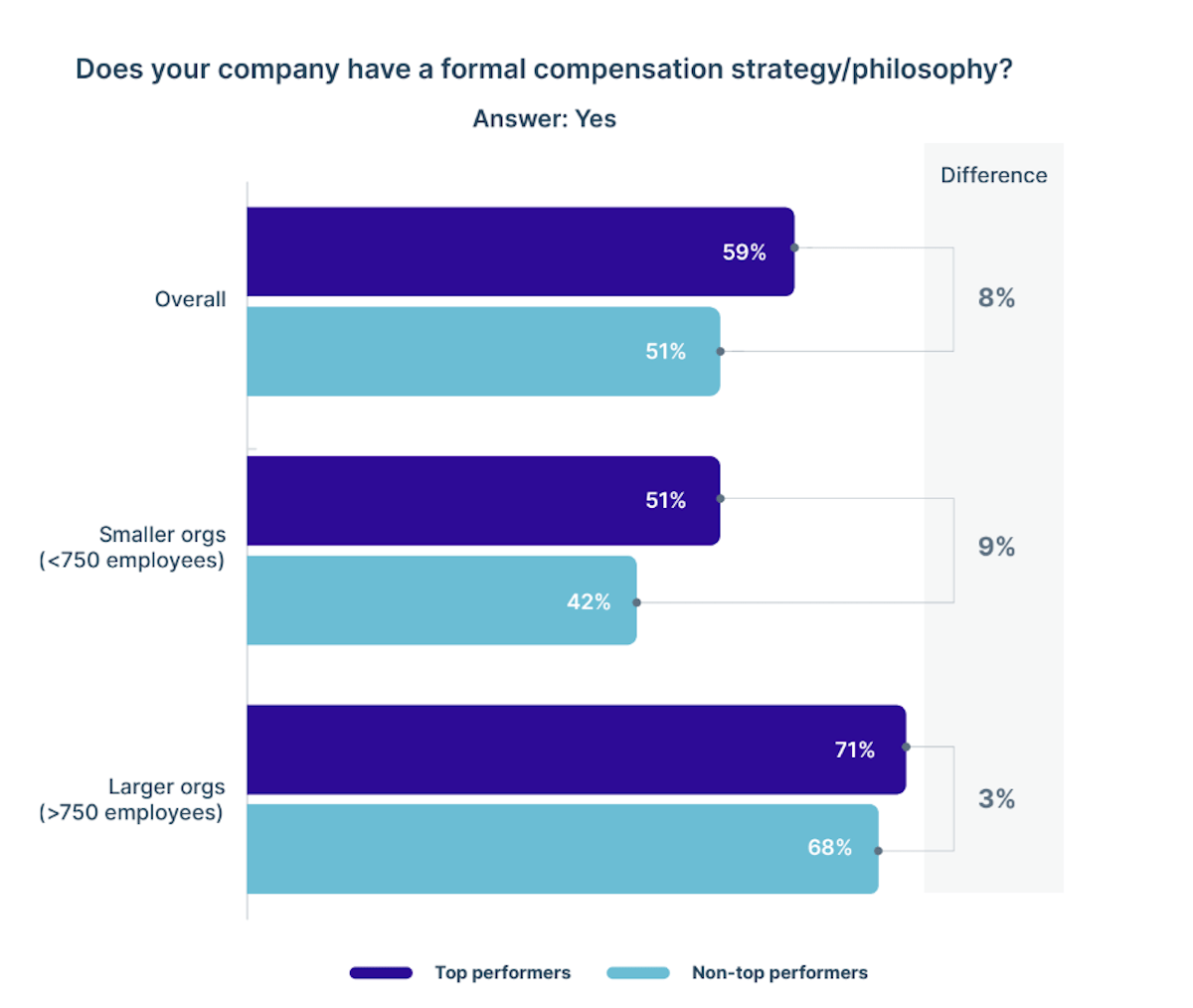 According to Payscale's dataset, overall, 59% of top performers have a formal compensation strategy, compared to 51% of non-top performers. When looking at company size, at organizations with less than 750 employees, 51% of top performers have a compensation strategy, compared with 42% of non-top performers.