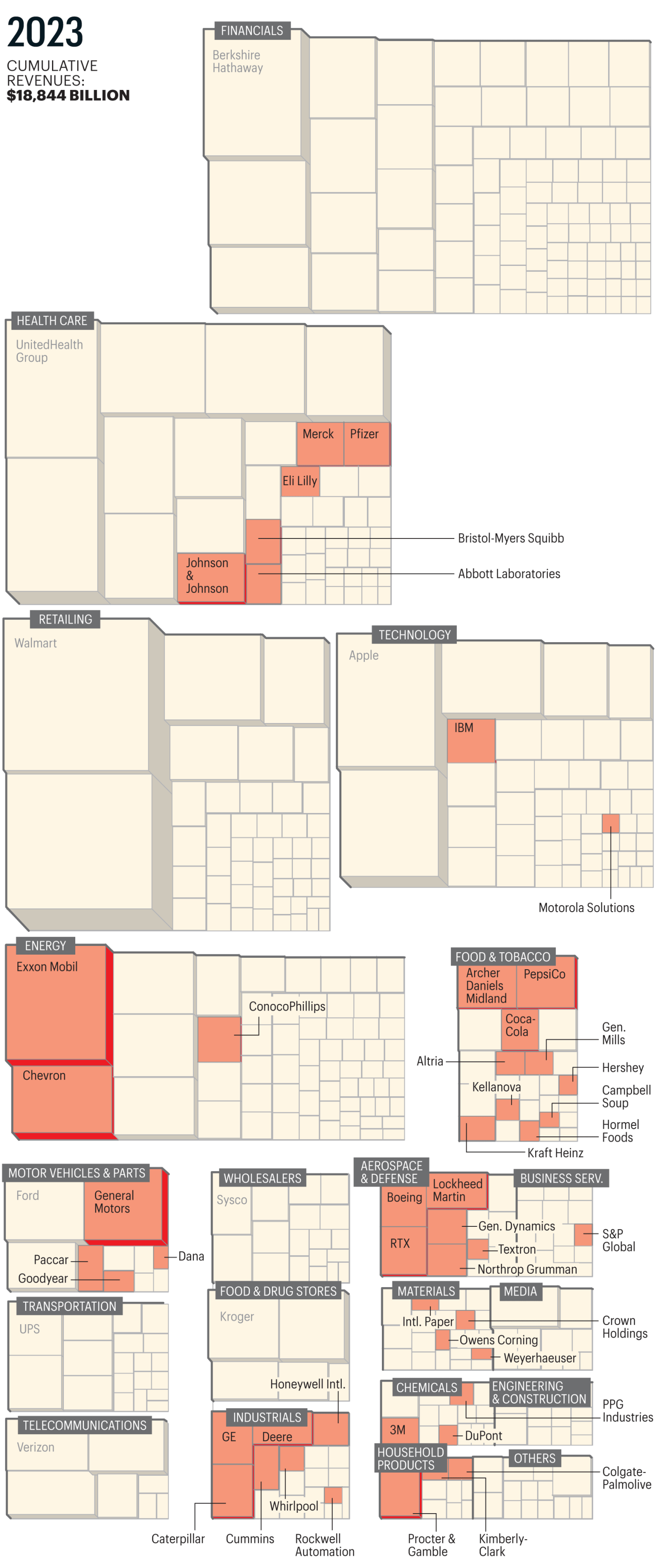 Almost 10% of the companies on this year’s Coins2Day 500—49 in all—have made our list of America’s biggest businesses by revenue every year since its first edition, in 1955. All 49 are highlighted in these graphics, which also show their size relative to other Coins2Day 500 companies.