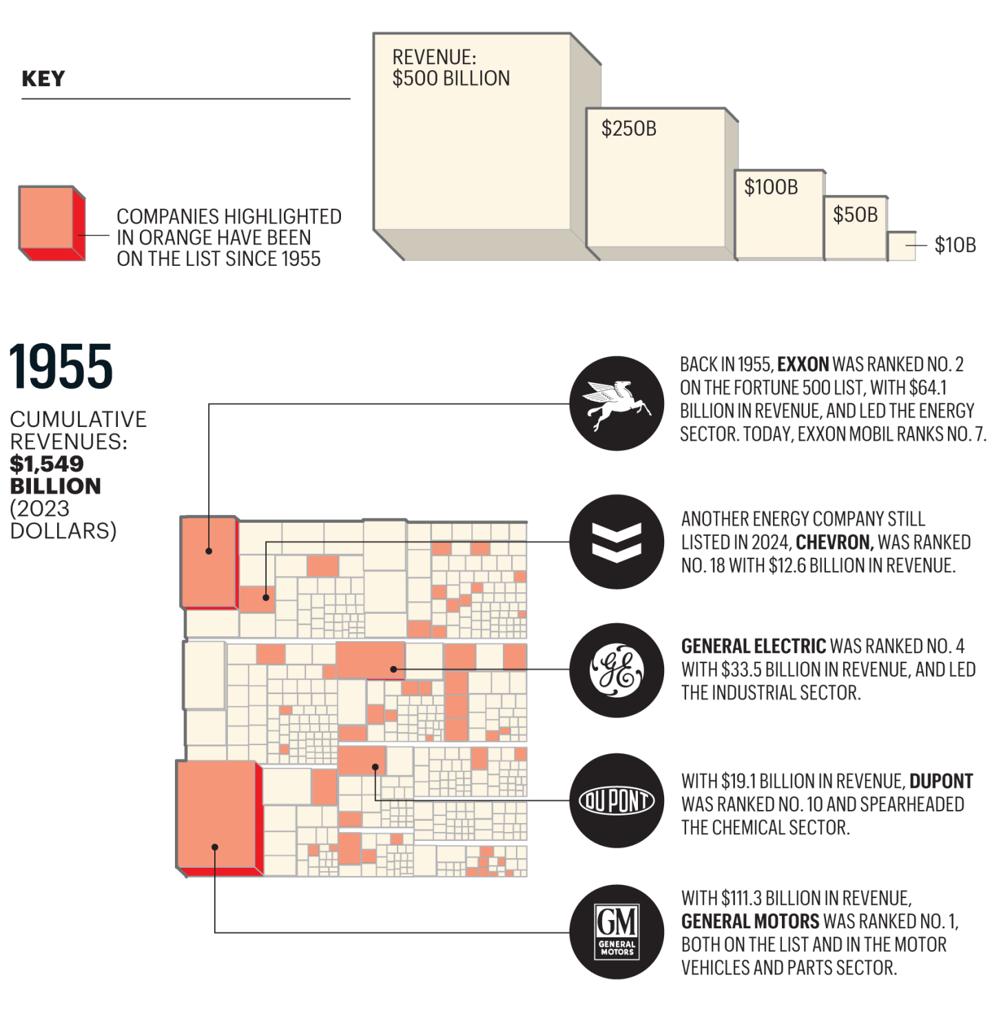 It’s an automotive nation. Six of the top 10 companies of 1955 either made cars or pumped the oil that fueled them. General Motors was No. 1; Chrysler (now part of Netherlands-based Stellantis) was No. 6. Ford Motor didn’t report revenue publicly at the time, but trust us, it was big. In the oil patch, Exxon was No. 2 and Mobil was No. 9. They merged in 1998; this year Exxon Mobil is the only Class of ’55 member in the top 10, at No. 7.