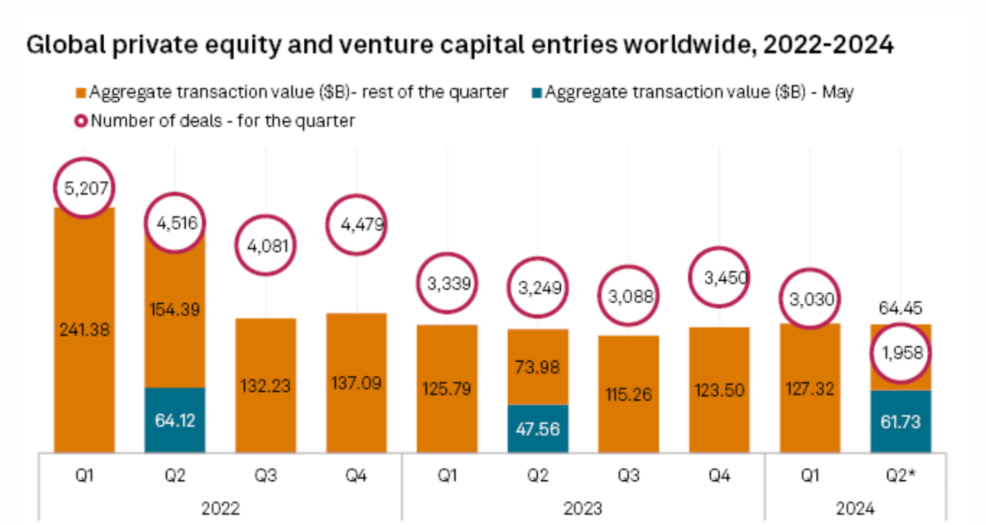 A new S&P Global Market Intelligence analysis finds that global private equity and venture capital deal value in May grew 29.2% to $61.73 billion from $47.56 billion in the same month in 2023. The research also found that deal value year to date totaled $251.11 billion, up 17.9% year over year. However, the number of deals went down to 4,988 from 5,451 in May 2023, according to the report.