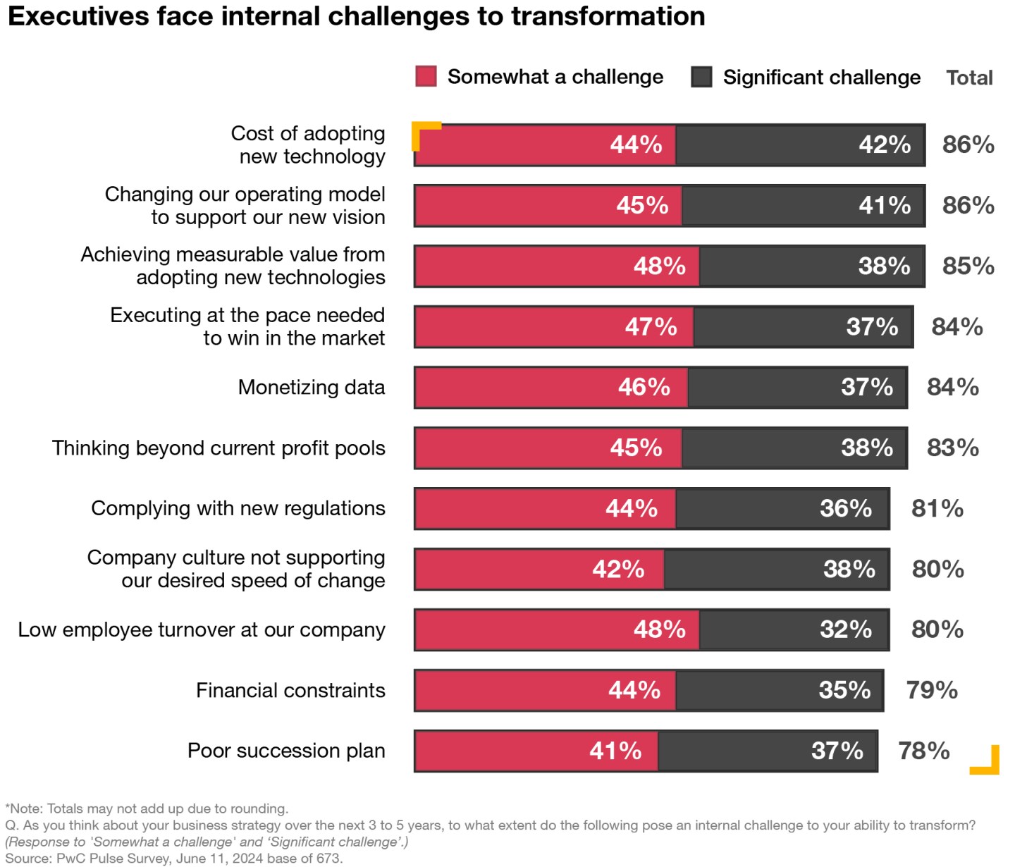 A challenging view. More than half of executives “agree” or “strongly agree” that they are behind the competition in adopting new technologies, a new survey of 673 U.S. Executives from PwC shows, up from 48% in August 2023. Costs are the top internal challenge that may be preventing companies’ efforts to reinvent their business, followed by changes to the operating model to support a company’s new vision and achieving measurable value from adopting new technologies.